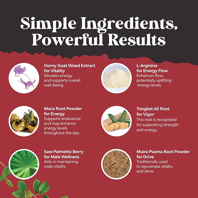 - POTENT BLEND OF PREMIUM INGREDIENTS – Includes Horny Goat Weed extract, Tongkat Ali, Panax Ginseng, Black Maca for men, Saw Palmetto, Tribulus Terrestris & Muira Puama, all chosen for their proven ability to support male efficiency and energy naturally.