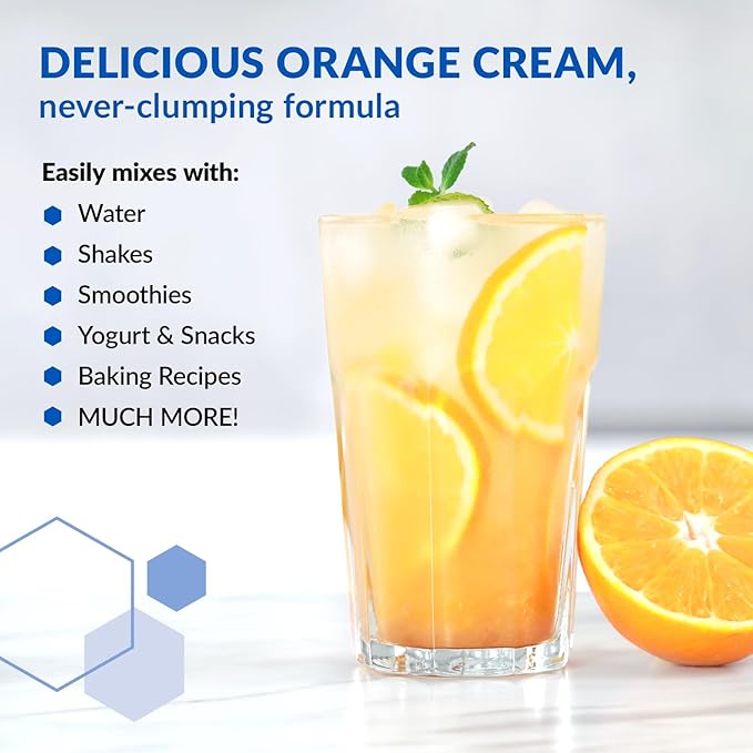 - DELICIOUS ORANGE CREAM, NO SUGAR. Our healthy low-carb protein powder is non-GMO, with no sugar, hormones, artificial sweeteners or colors.