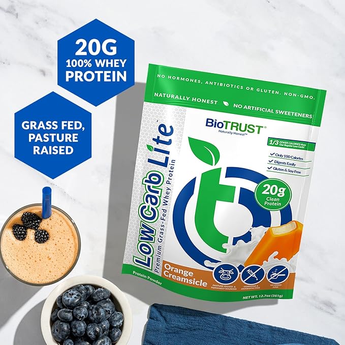 BioTrust Low Carb Lite, 20 Grams of Grass-Fed Whey Protein Isolate, 100 Calories, ProHydrolase Digestive Enzymes, Non-GMO, Free from Soy and Gluten, rBGH-Free (14 Servings) (Orange Cream)