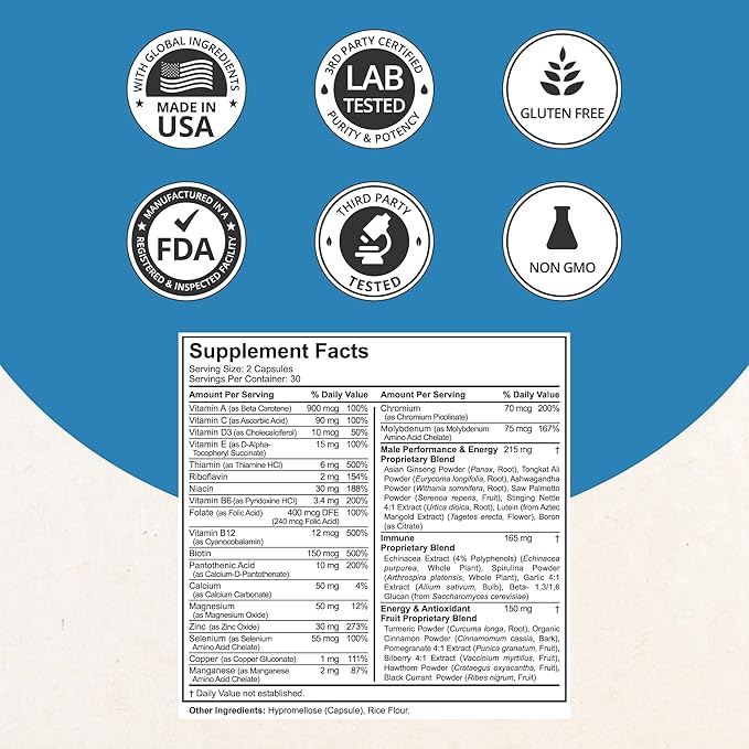 - Immunity and Health Support: Powerful botanical blends together and multivitamins for men like Vitamins A, C, E, and Zinc help promote overall health and wellness by combating free radicals and strengthening the immune system.