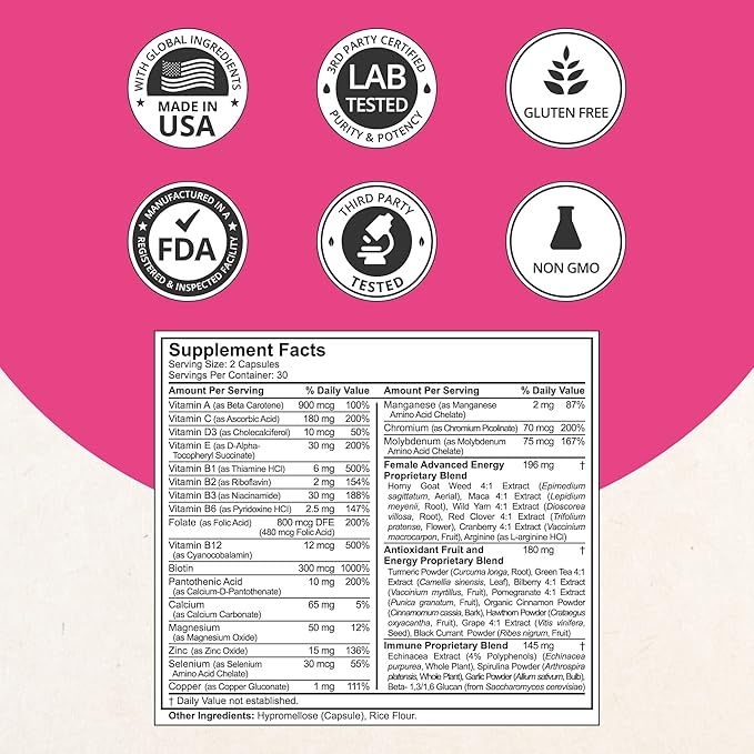 39-in-1 Capsules Horny Goat Weed, Maca, Wild Yam, Red Clover, Cranberry, Arginine, Vitamins, Minerals, Herbals Supplement for Women by Women's Multi 18+ - Support Women's Health - 60 Vegan Capsule