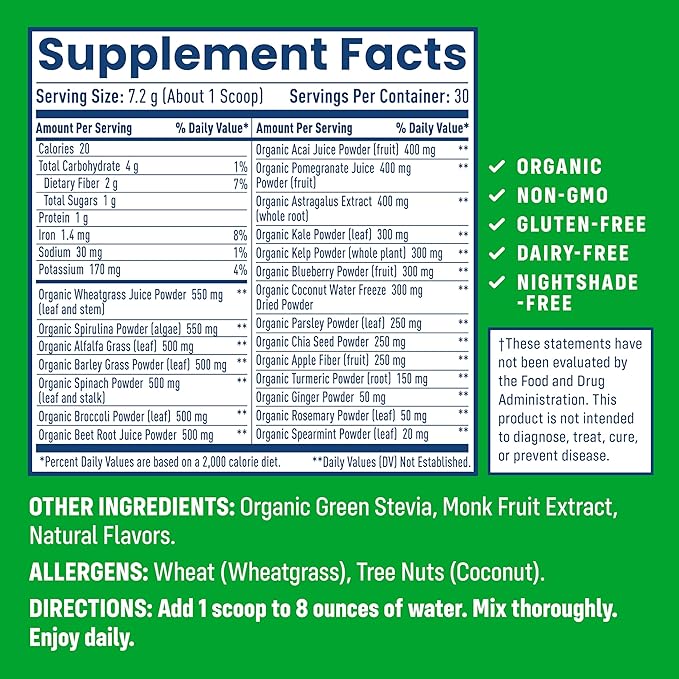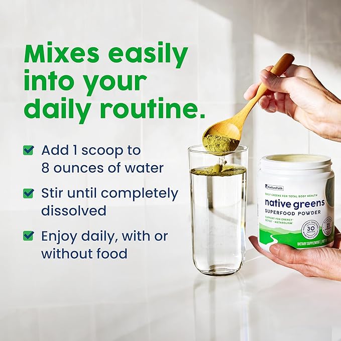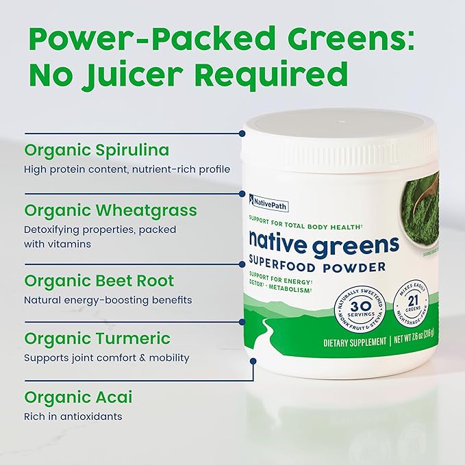 - 21 ORGANIC SUPERFOODS: Native Greens combines 21 organic superfoods, including nutrient-dense greens, antioxidant-rich fruits, and powerful adaptogens. This comprehensive blend supports overall health, energy, digestion, and more—in just one scoop per day.