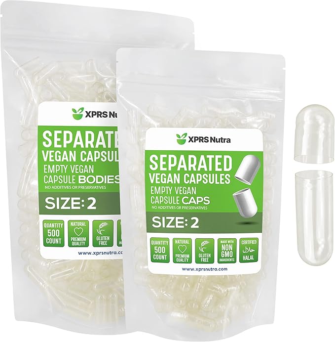 XPRS Nutra Vegan Size 2 Separated Capsules - 500 Count Premium Empty Capsules Separated in Bags - Clear Empty Capsules - Separated Empty Capsules - Pill Capsules Empty for DIY Supplement Filling