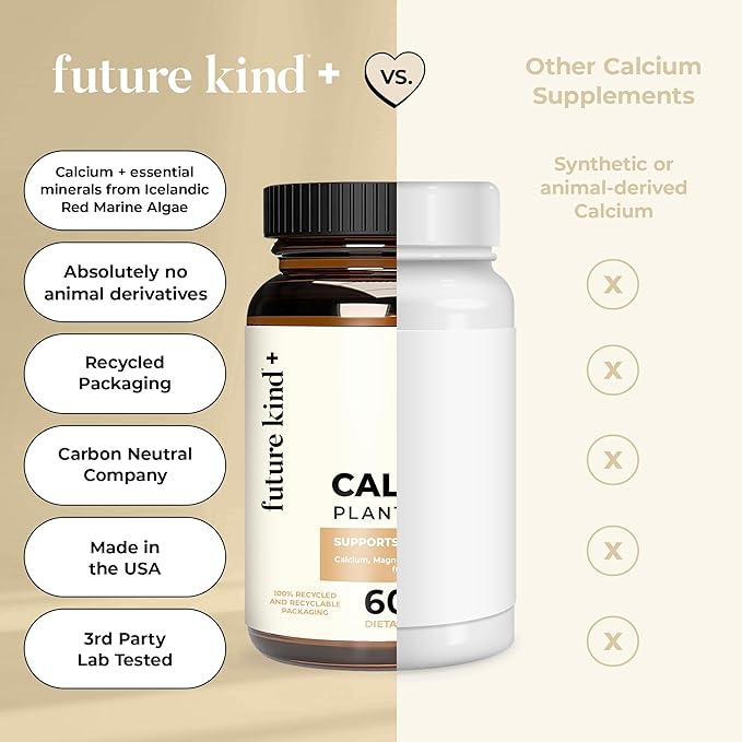 Future Kind Vegan Calcium Supplement (60 Capsules) - Plant-Based Calcium Magnesium Supplement Sourced from Iceland for Teeth and Bone Support - Calcium Supplements for Women & Men