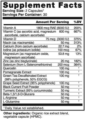 - ALL THE BEST INGREDIENTS IN ONE EASY-TO-SWALLOW CAPSULE: Packed with key ingredients and antioxidants for immunity defense and to keep you feeling healthy, including 3 forms of vitamin C, vitamin A, vitamin D, niacinamide, selenium, zinc, quercetin, grape seed, pomegranate, green tea, black currant, turmeric, magnesium, iodine and L-Glutamine for an all-around immune system defense.