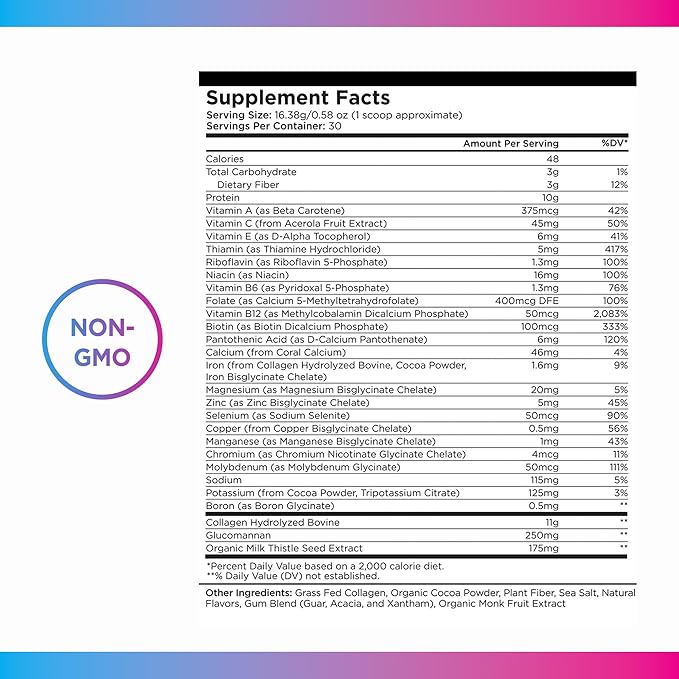 - Special Ingredients : Vitamin A (as Beta Carotene), Vitamin C (from Acerola Fruit Extract), Vitamin E (as D-Alpha Tocopherol), Thiamin (as Thiamine Hydrochloride), Riboflavin (as Riboflavin 5-Phosphate), Niacin (as Niacin), Vitamin B6 (as Pyridoxal 5-Phosphate), Folate (as Calcium 5-Methyltetrahydrofolate), Vitamin B12 (as Methylcobalamin Dicalcium Phosphate), Biotin (as Biotin Dicalcium Phosphate), Pantothenic Acid (as D-Calcium Pantothenate), Calcium (from Coral Calcium), Iron (from Collagen Hydrolyzed Bovine, Cocoa Powder, Iron Bisglycinate Chelate), Magnesium (as Magnesium Bisglycinate Chelate), Zinc (as Zinc Bisglycinate Chelate), Selenium (as Selenium Chelate), Copper (from Copper Bisglycinate Chelate), Manganese (as Manganese Bisglycinate Chelate), Chromium (as Chromium Nicotinate Glycinate Chelate), Molybdenum (as Molybdenum Glycinate), Chloride, Sodium, Potassium (from Cocoa Powder, Tripotassium Citrate), Boron (as Boron Glycinate), Collagen Hydrolyzed Bovine, Glucomannan, Organic Milk Thistle Seed Extract, Grass Fed Collagen, Organic Cocoa Powder, Sea Salt, Natural Flavors, Gum Acacia, Organic Monk Fruit Extract Vitamin A (as Beta Carotene), Vitamin C (from Acerola Fruit Extract), Vitamin E (as D-Alpha Tocopherol), Thiamin (as Thiamine Hydrochloride), Riboflavin (as Riboflavin 5-Phosp… See more