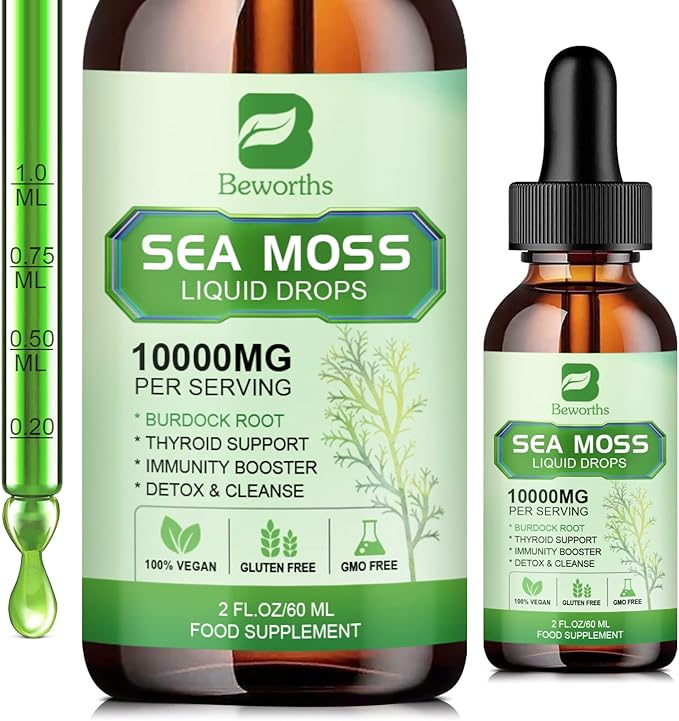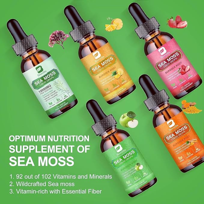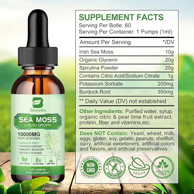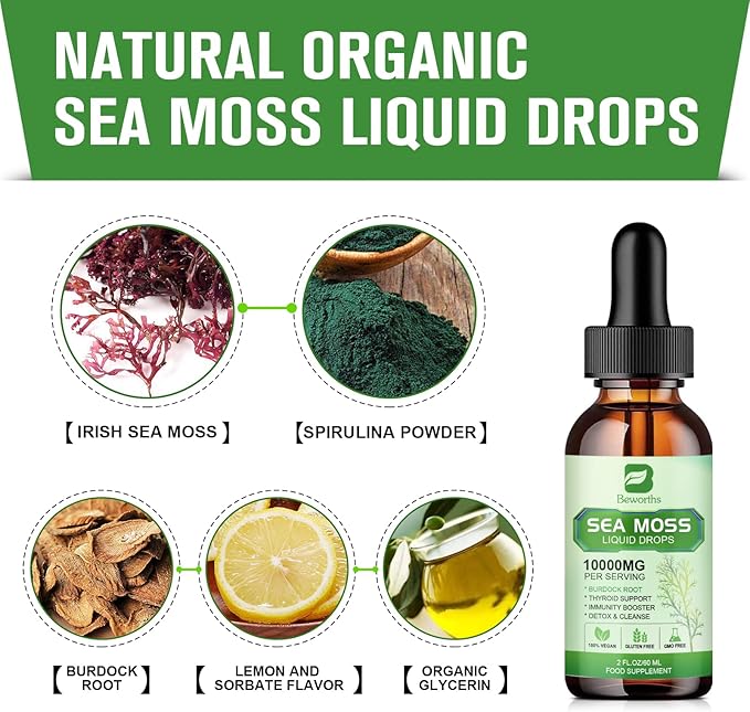 - 【Organic Nutrient-Rich Sea Moss】: Our organic Irish sea moss liquid drops are powerful drinking energy supplements. It includes the ingredients 10000 mg of Irish sea moss, 350 mg of burdock root and 20000 mg of spirulina powder to deliver vitamins and minerals for your body's maximum nourishment!
