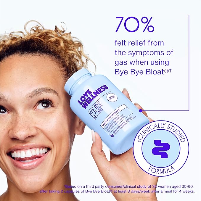 - FAST & EFFECTIVE BLOATING RELIEF: Kiss digestive woes goodbye with our safe, effective blend designed to help provide bloating and gas relief and promote healthy digestion.* Digestive enzymes and herbs in Love Wellness Bye Bye Bloat support digestive health and normalized water retention.* Serving size 2 capsules, 90 servings per bottle.