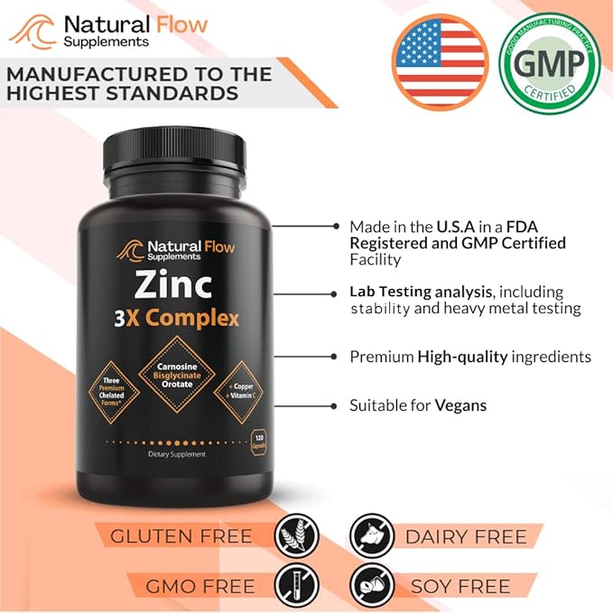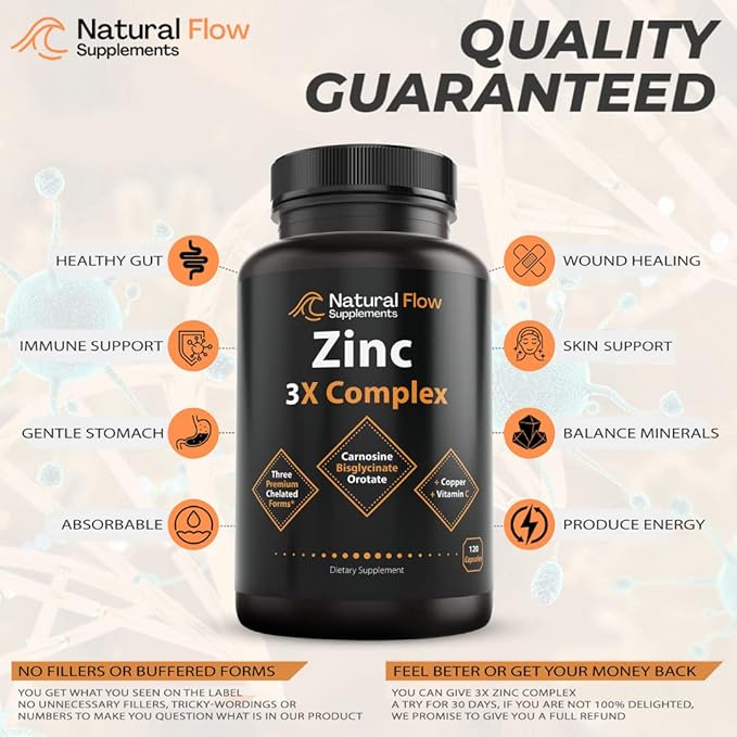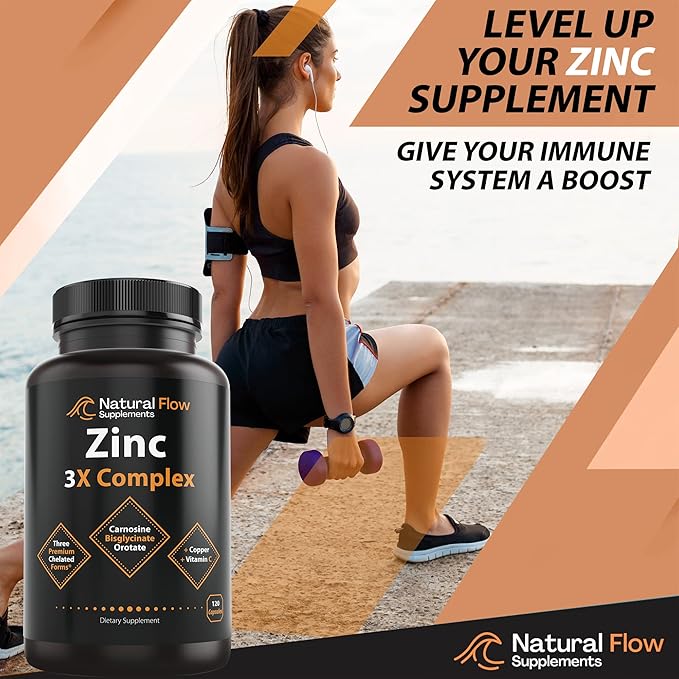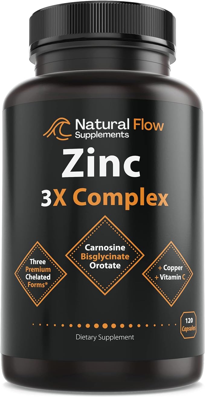 Zinc Supplement Complex with Copper and Vitamin C - Natural Flow 3X Zinc Carnosine, Bisglycinate Chelate, and Orotate, Chelated Zinc Copper, Easy on The Stomach, Skin and Immune Support, 120 Capsules