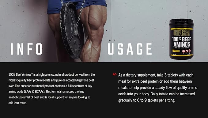 - SUSTAINED-RELEASE: Universal 100% Beef Amino Tablets contain sustained-release beef aminos to ensure that you have a constant amount of beef aminos at all times and to provide a steady flow of quality amino acids into your body with Easy to digest and convenient tablets