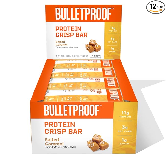 - Contains one 12-count box of Bulletproof Salted Caramel Protein Crisp Bars