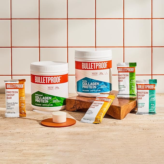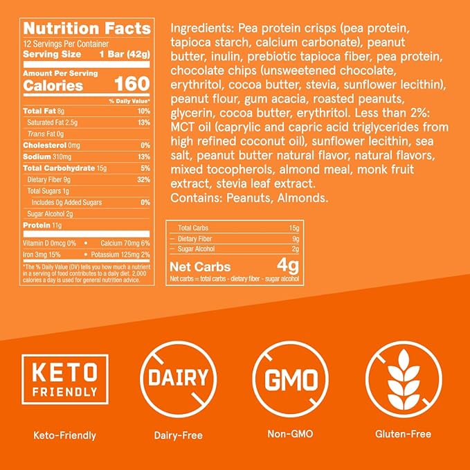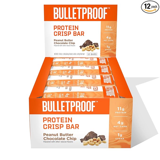 - Contains one 12-count box of Bulletproof Peanut Butter Chocolate Chip Protein Crisp Bars