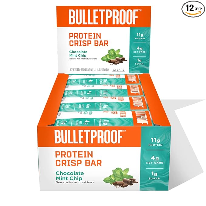 - Contains one 12-count box of Bulletproof Chocolate Mint Chip Protein Crisp Bars