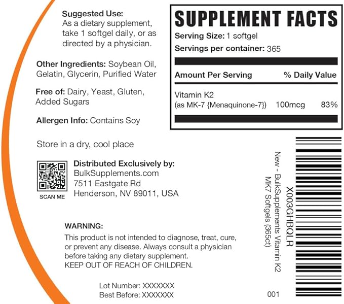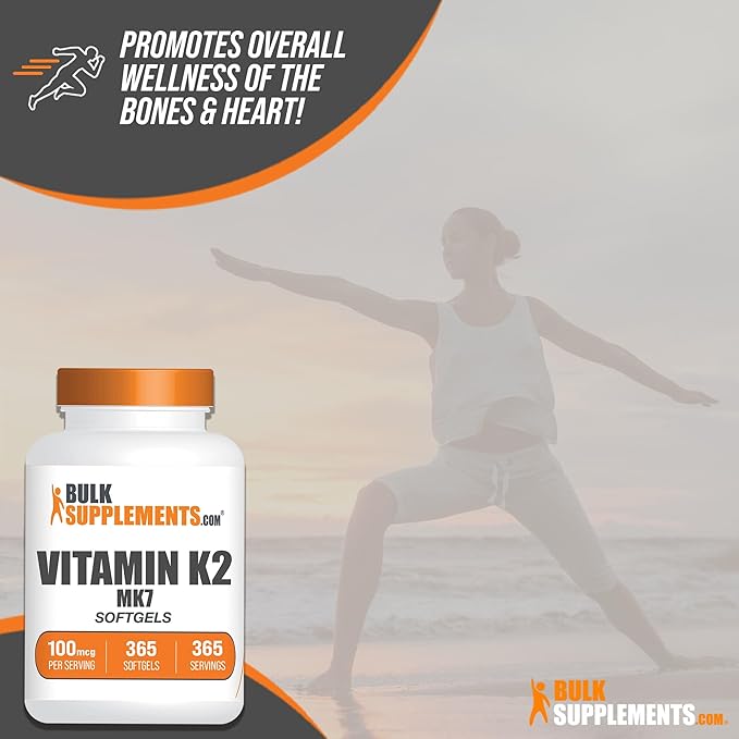 BulkSupplements.com Vitamin K2 Softgels - Vitamin K2 MK7, Vitamin K2 Supplement, MK7 Vitamin K2 for Bones - Gluten Free, Vitamin K2 100 mcg, 1 Softgel per Serving, 365 Count (Pack of 1)