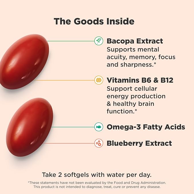 - THE GOODS INSIDE: Expert blend with Bacosides from Bacopa Extract, Blueberry Extract, Omega-3s, and Vitamins B6 and B12.