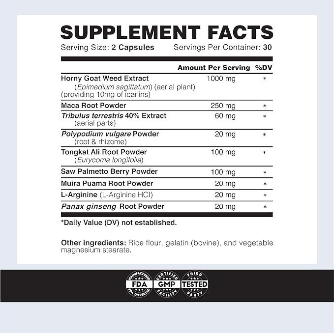 - Special Ingredients : Tribulus Terrestris, Horny Goat Weed, Maca Root Powder