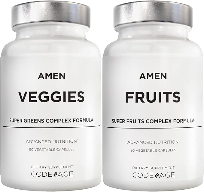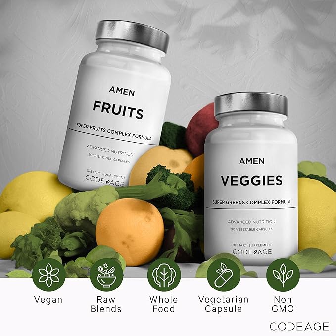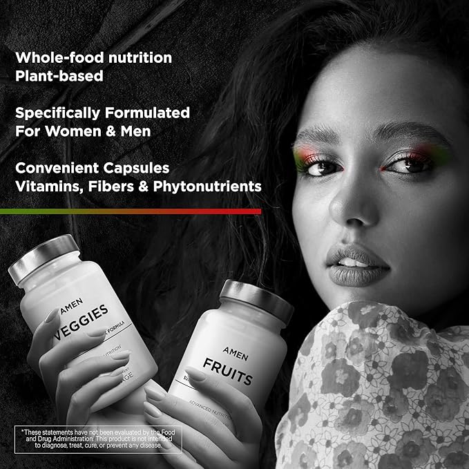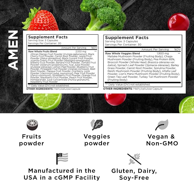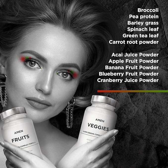 - Over 30 Fruits & Vegetable Extracts in One Bundle Pack: Amen Fruits + Veggies daily multivitamins supplement bundle contains vitamins, minerals, fibers, and more from vegetables, berries, and fruits extracts in a supplement bundle for both women and men. Amen daily fruit capsules and greens vitamins is a convenient way to incorporate superfood fruit vitamins and super greens veggies into both women’s and men’s wellness routines.