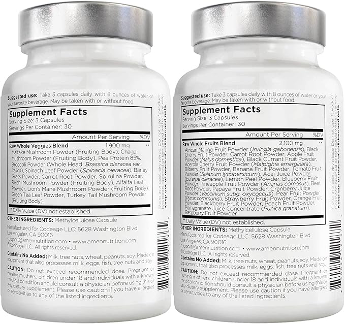 - Vegan, Non-GMO, Manufactured in the USA: Amen fruits and super greens complex formulas are both vegan, non-GMO and manufactured in the USA with global ingredients in a cGMP-certified facility for quality and purity. These two superfood nutritional solutions are plant-based, gluten-free, soy-free, and dairy-free. Amen raw greens capsules + whole fruits vitamin blend does not contain additives, binders, flow agents, artificial flavors, colors or artificial ingredients.