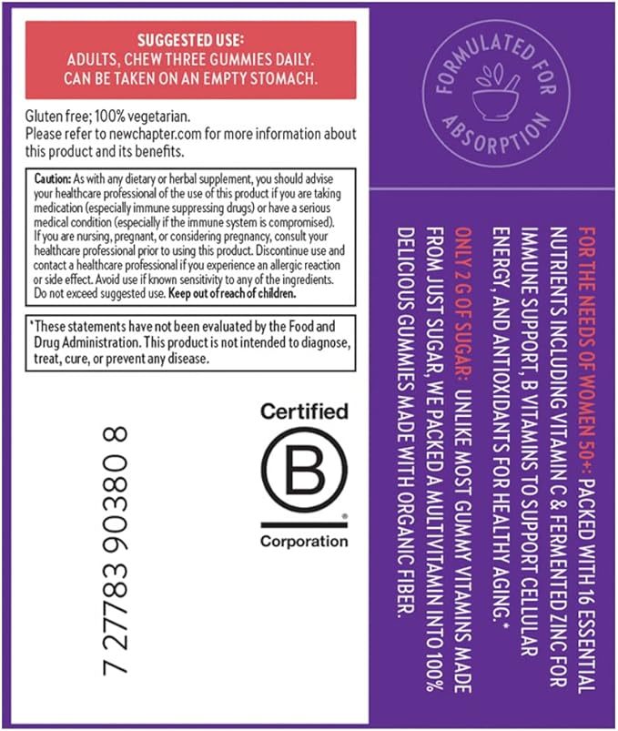 New Chapter Women’s 50+ Multivitamin Gummies – 66% Less Sugar, Women’s Healthy Aging Gummy Vitamins with Vitamin C, B Vitamins & Zinc, Non-GMO, Gluten Free, Berry Citrus Flavored, 90 ct