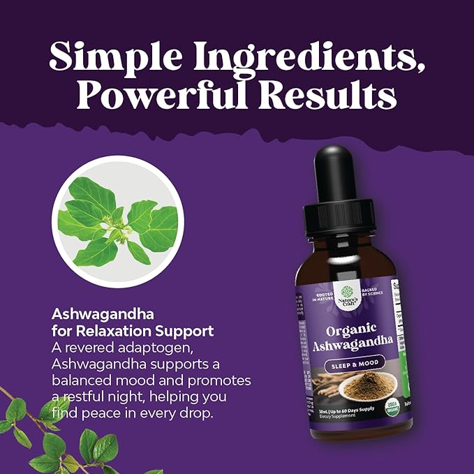 USDA Organic Ashwagandha Liquid Drops - Vegan Liquid Ashwagandha Root Extract for Energy Stress and Mood Support - Delicious Adaptogenic Pure Ashwagandha Tincture for Adults - Non-GMO & Alcohol Free