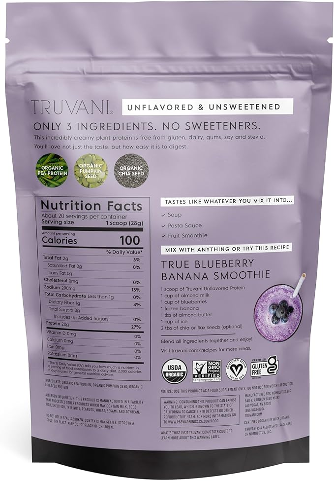 Truvani Vegan Pea Protein Powder | Unflavored | 20g Organic Plant Based Protein | 20 Servings | Keto | Gluten & Dairy Free | Low Carb | No Added Sugar