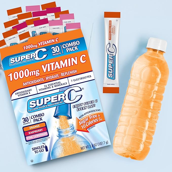 - CONVENIENT – Packaged in perfectly portioned drink mix sticks, it’s easy and convenient to enhance your water with Super C. Simply add one stick to a 16.9 oz. bottle or glass of water, shake/stir, and enjoy. Add to 20 oz. of water for a milder flavor