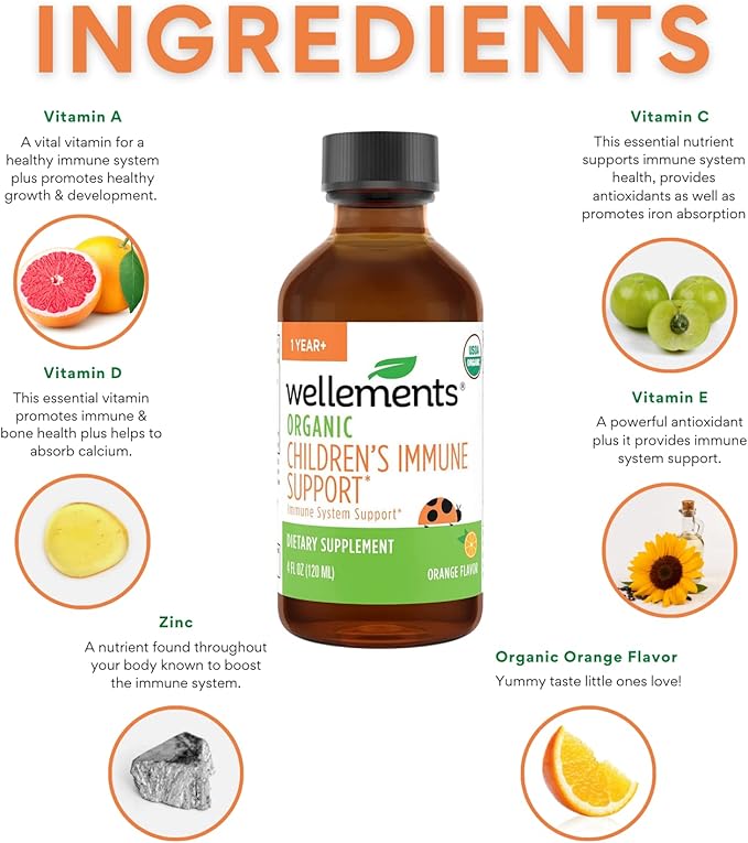 Wellements Organic Children’s Immune Support Syrup | Immune System Support* for Kids w/Vitamin C & Zinc, USDA Organic, Free from Dyes, Parabens & Top 9 Most Common Allergens | Orange Flavor, 4 fl oz