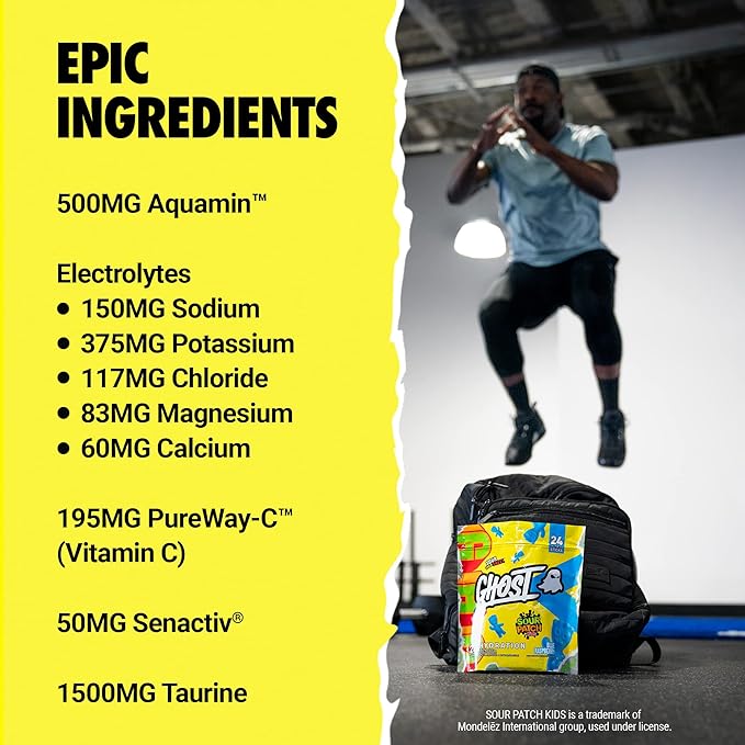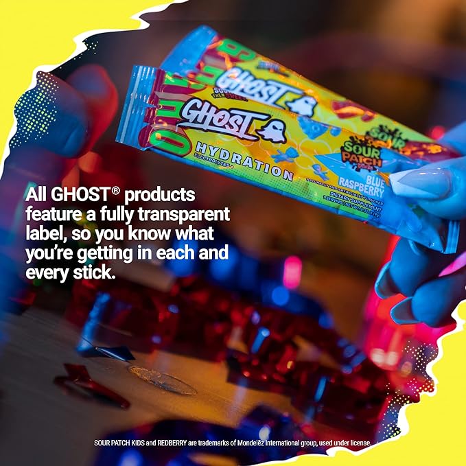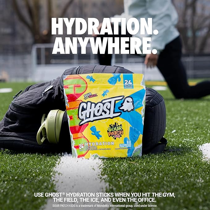 - Stay Hydrated: GHOST Hydration can be used anytime to elevate your water or replace sugary sports drinks. Grab a bottle of water (or your favorite GHOST shaker), toss in a stick of GHOST Hydration, and enjoy some seriously epic-tasting, electrolyte-enhanced H2O while you hit the gym, the field, the ice, or even the office on a Monday. Sour Patch Kids Blue Raspberry flavor. 1 stick per serving, 24 servings per container.