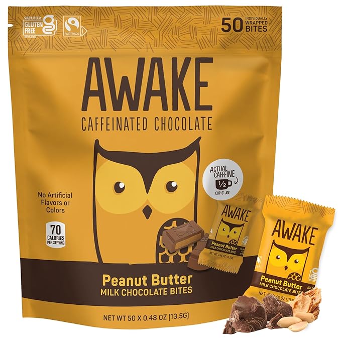 AWAKE - Caffeinated Chocolate Bites - Peanut Butter Milk Chocolate, 50 Bites - 50mg Caffeine - Wrapped Energy Bites - Coffee Alternative - Fairtrade, Gluten Free, Non GMO - 0.48oz