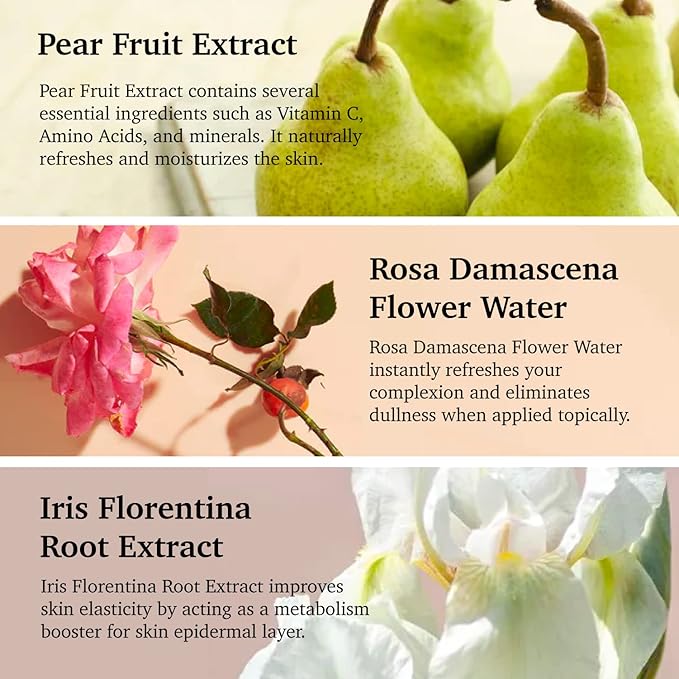 - [KEY INGREDIENTS] also include nutrient-dense botanicals such as pear fruit extract that naturally refreshes and moisturizes the skin, rosa damascene flower water that eliminates dullness and iris Florentina root extract that improves skin elasticity.