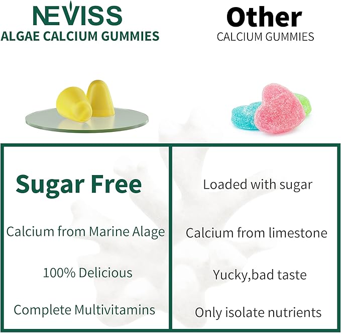 - ✨ Made in the USA, Quality Guaranteed : Neviss Algae Calcium gummies are produced, tested, and bottled in a third-party facility in the USA to ensure exceptional quality and consistency. They are free of soy, gluten, and artificial additives such as colors and flavors. We stand behind every purchase with a 100% satisfaction guarantee. If you have any questions, please contact us, and we will resolve them promptly.