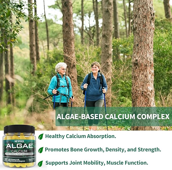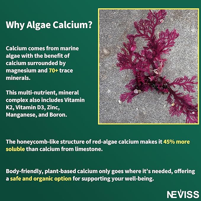 - 🦴 Algae Calcium Gummies: Neviss's red algae is sustainably harvested from the North Atlantic seabed. It is rich in calcium, magnesium, and more than 72 trace minerals. Bone mineralization is further enhanced when taken with Vitamin D3 and Vitamin C. Our Algae-Based Calcium Gummies are designed to provide the structural components, as well as to help support the complex processes involved in building and maintaining strong, healthy bone structure.