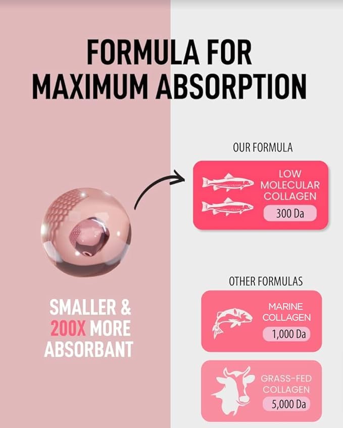 - GET GLOWING SKIN - Highly absorbent Collagen 300, 1 sachet (3g) contains a high concentration of 300 daltons small molecular weight collagen (1,500mg) which is smaller than normal collagen which enhances its absorption. The key difference in collagen is the absorption rate, and at the size of 300 dalton intake group, it is up to 200 times more absorbent than the 5,000 dalton intake group. Making our supplement more efficient and effective in delivering its skin benefiting effects.
