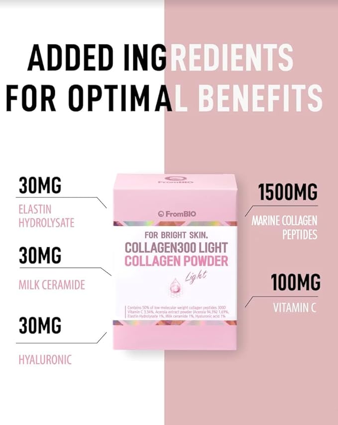 - SKIN BENEFITING BOOSTERS - Not only does our supplement contain low molecular weight collagen peptide, it is also formulated with elastin hydrolyzate from France's Copalis, an elastin specialized company with IFFO-RS, MSC ISO22000 certification, milk ceramide from New Zealand, Hyaluronic Acid from South Korea, and 100% daily recommended intake of Vitamin C, making our Collagen 300 Light the supplement to help achieve glowing bouncy skin.