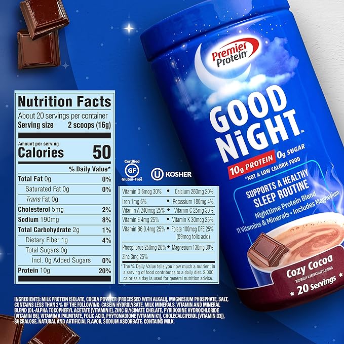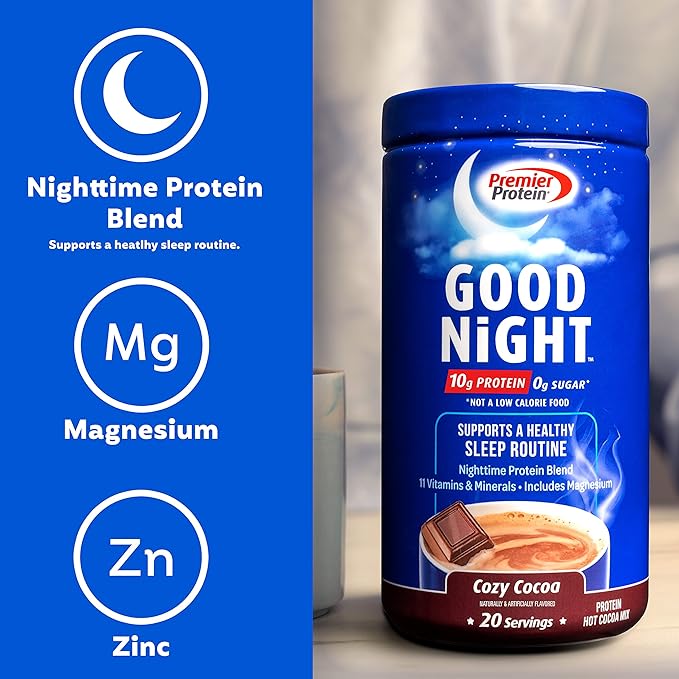 Premier Protein Good Night Protein Powder, Hot Cocoa Mix, 10g Protein, 0g Sugar, 11 Vitamins & Minerals, Nighttime Protein Blend, Magnesium, Zinc, 20 Serve, 1 Tub