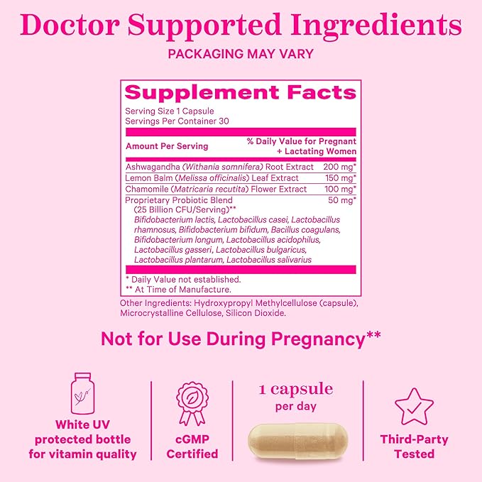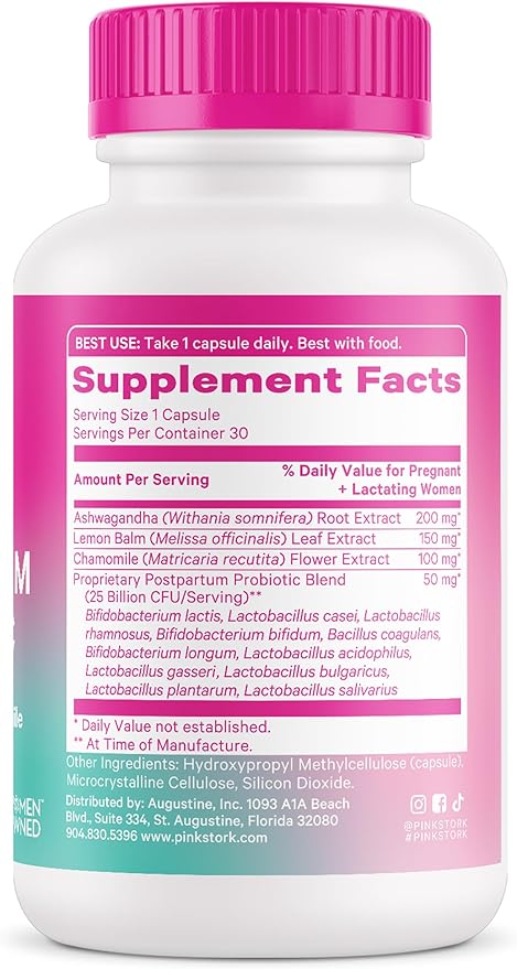 Pink Stork Probiotics for Postnatal Women - 30 Billion CFUS with Ashwagandha and Chamomile, Postpartum Essentials for Hormone Balance, Mood Support, Gut Health, Digestive Wellness, 30 Capsules