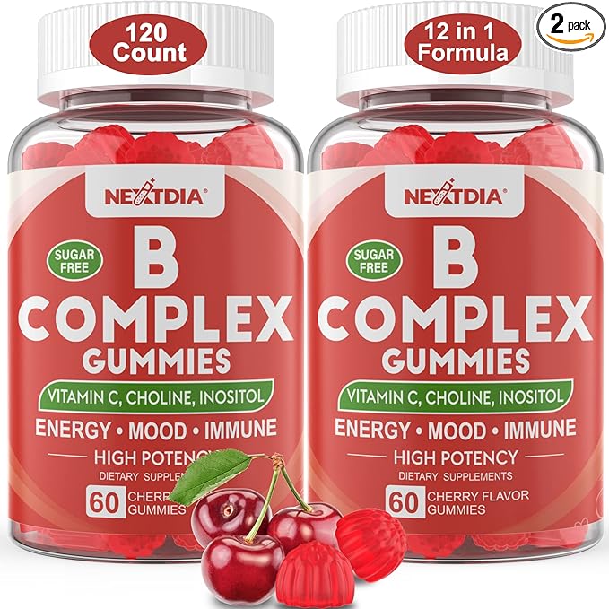 - Superior Potency Vitamin B Complex - Your body needs B-complex vitamins to function optimally. They supports functions such as energy production, metabolism, brain health, heart health and natural prenatal health. Our Nextdia’s formula delivers all 8 essential B vitamins B1, B2, B3, B5, B6, B7, B12 and folate. Also added vitamin C, zinc, choline and inositol, making it the most potent available gummies.
