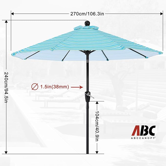 ABCCANOPY 9FT Patio Umbrella - Outdoor Waterproof Table Umbrella with Push Button Tilt and Crank, 8 Ribs UV Protection Pool Umbrella for Garden, Lawn, Deck & Backyard (Turquoise Stripes)