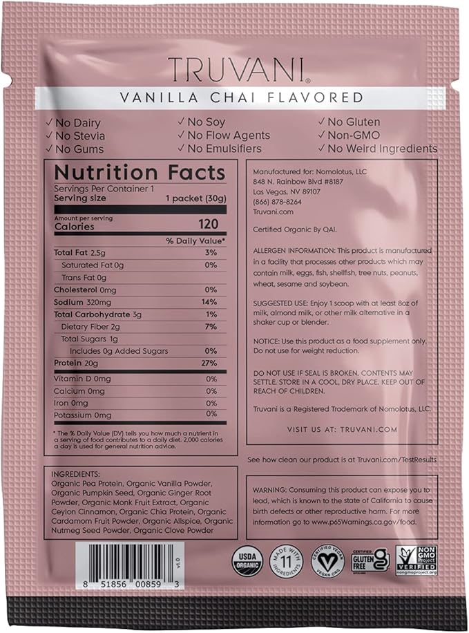 Truvani Vegan Pea Protein Powder | Vanilla Chai | 20g Organic Plant Based Protein | 1 Serving | Keto | Gluten & Dairy Free | Low Carb | No Added Sugar