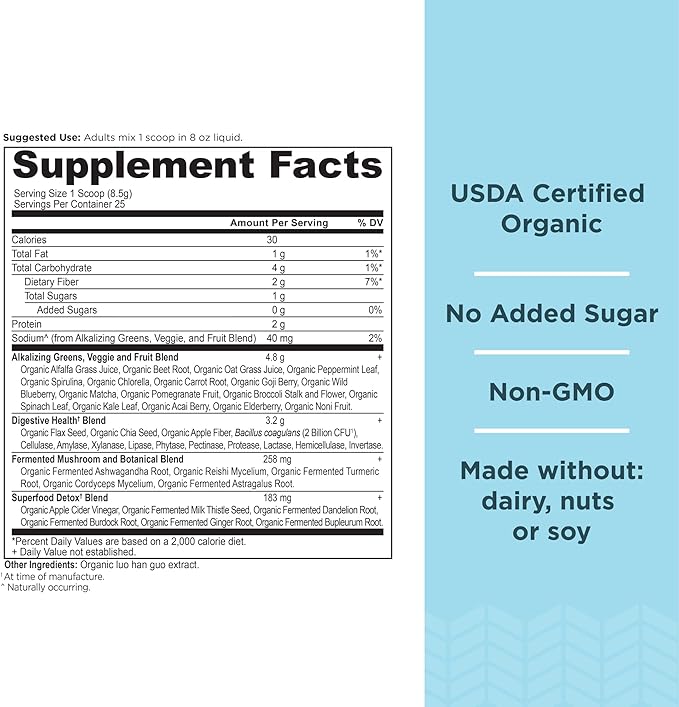 - GREAT TASTING: Get the benefits of juicing every day without the hassle. This greens powder is packed with 25+ greens, fruits and herbs (plus probiotics) and features a proprietary organic Superfood Detox Blend that includes alkalizing superfoods like apple cider vinegar, milk thistle and spirulina plus a probiotic to help you digest and detox.