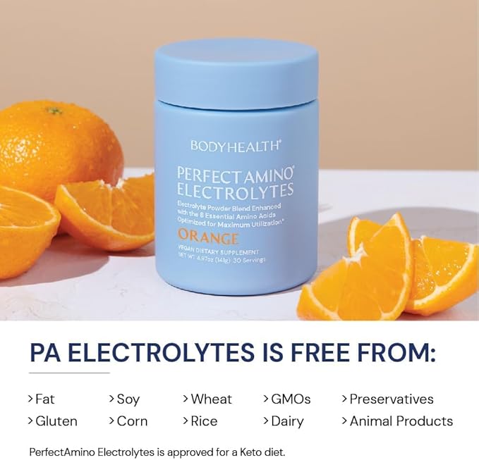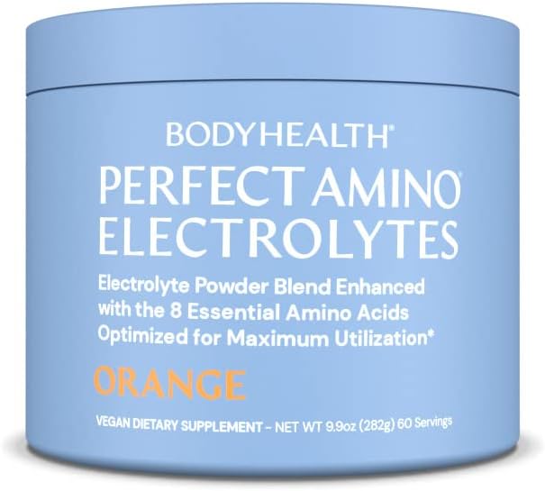 BodyHealth PerfectAmino Electrolytes Powder, Hydration Powder, Sugar Free Keto Electrolyte Drink Mix, Non GMO, Orange Flavor (60 Servings)