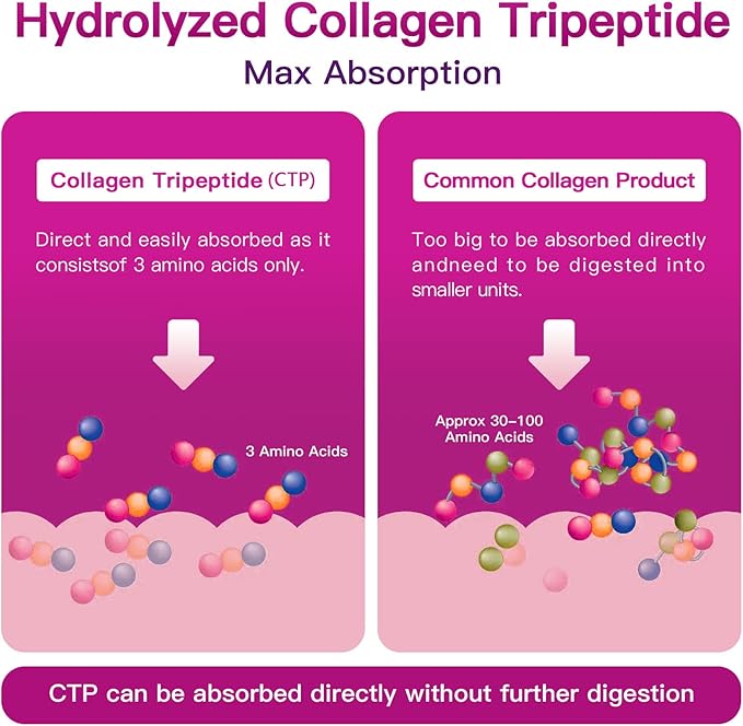 - COLLAGEN TRIPEPTIDE FOR ENHANCED ABSORPTION - Collagen Tripeptide (CTP) is composed of three amino acids (Glycine-Proline-Hydroxyproline), which has the property of being preferentially absorbed by skin, bone, cartilage and tendon, and can be easily and quickly absorbed directly by the intestinal tract.