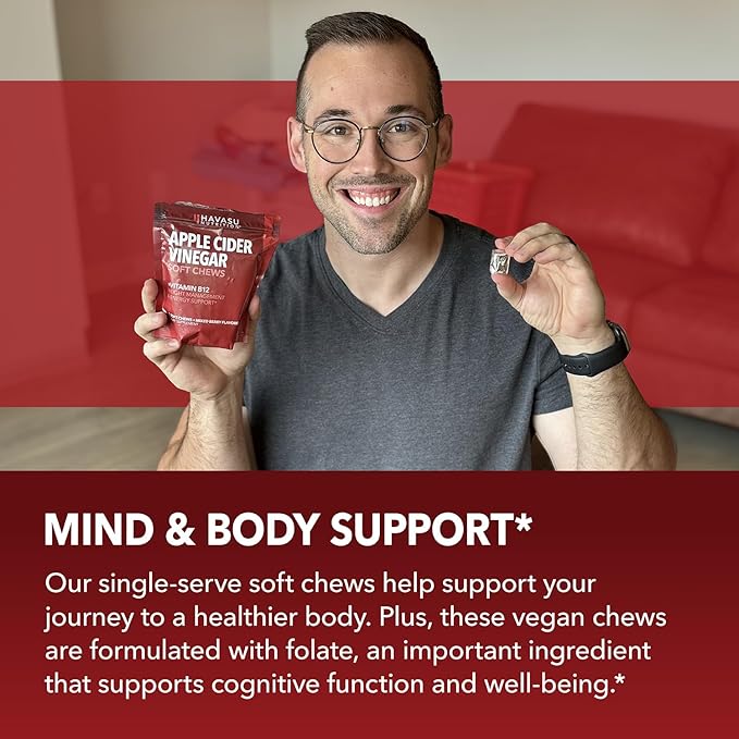 - With Vitamin B12 and Folate added to the ACV chews, it gives the supplement powerful benefits for energy and digestive health.