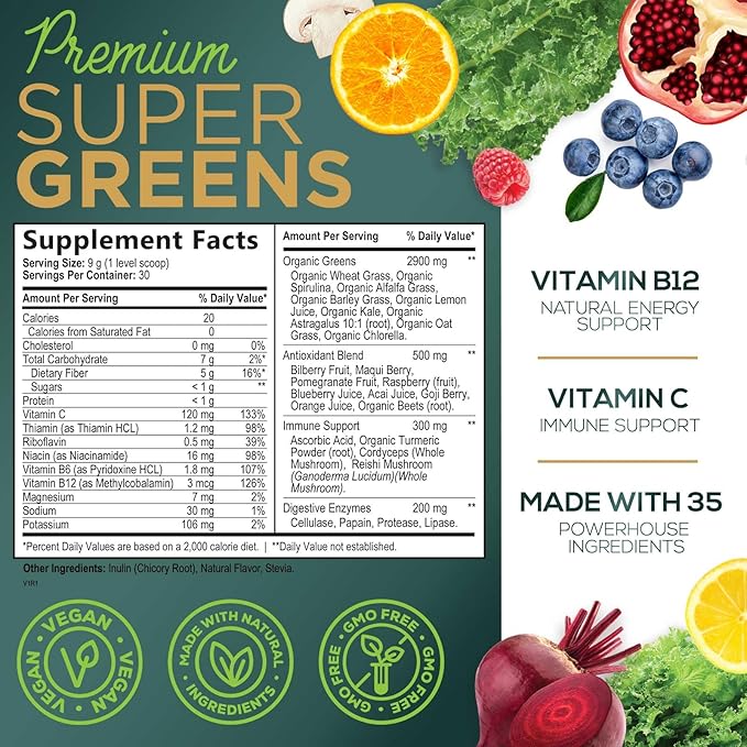 Super Greens Superfood Powder Drink Mix - Green Whole Food Blend for Energy & Gut Health with Spirulina, Chlorella, Mushrooms, Vegetables, Digestive Enzymes Antioxidant & Probiotics - 30 Servings
