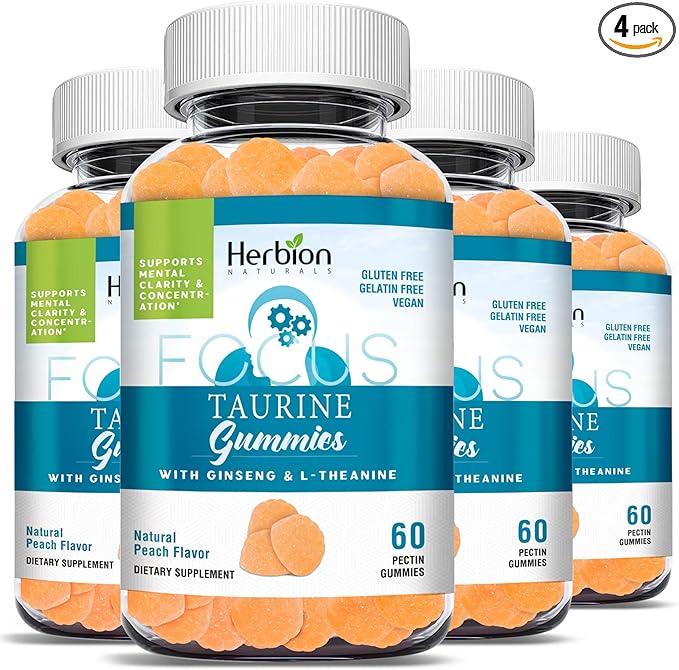 HERBION Naturals Taurine Gummies with Ginseng, L-Theanine, Vitamin C, B3, B6, & B12, Support Mental Clarity & Concentration*, Natural Peach Flavor, Gluten-Free, USA Made, 240 Count (Pack of 4)