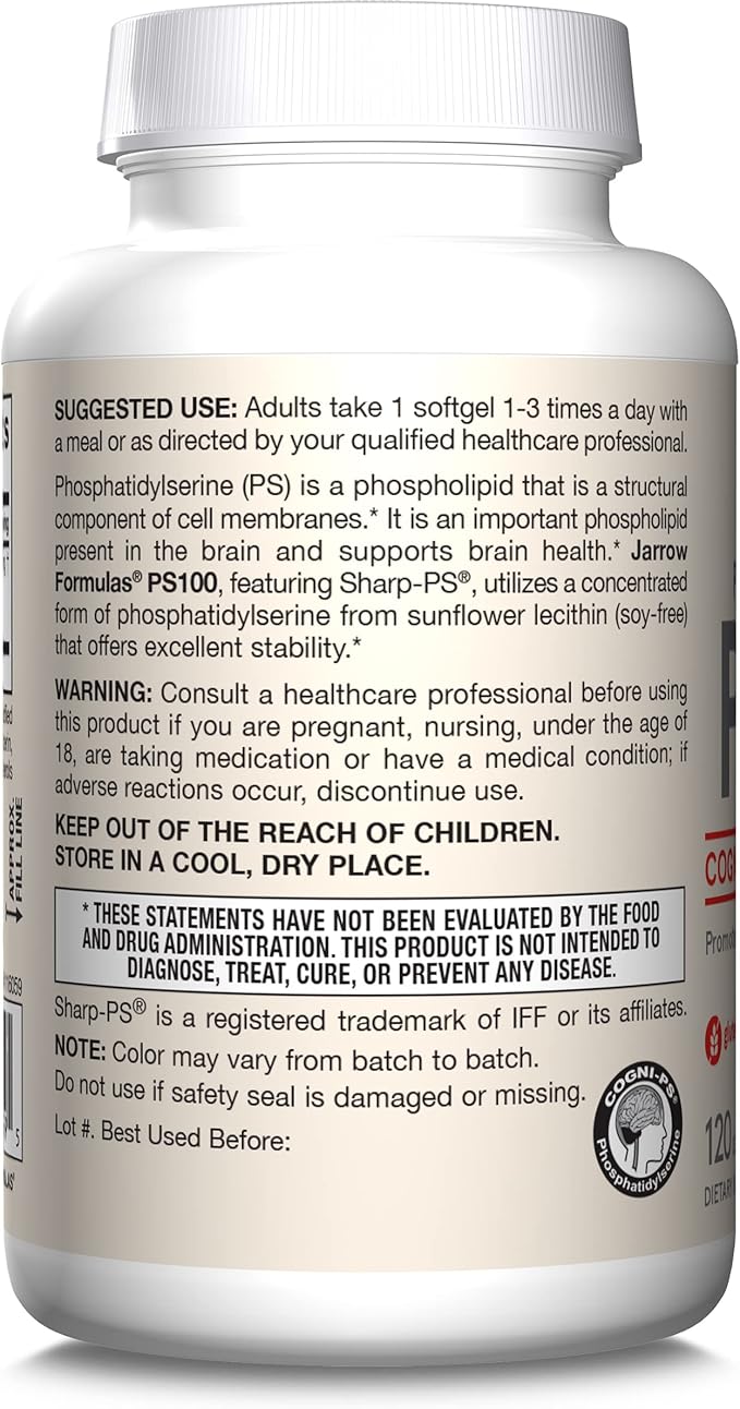 - Brain Health and Cognition Support Supplement: Contains one 120 count bottle of Jarrow Formulas PS100 Phosphatidylserine 100 mg softgels for a 40- to 120-day supply
