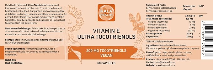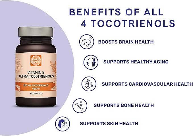 KALA HEALTH Ultra Tocotrienol 200mg Vitamin E Vegan – All 4 tocotrienols - Tocopherol Free - Supports Immune Health & Antioxidant Health Tocotrienols Supplement