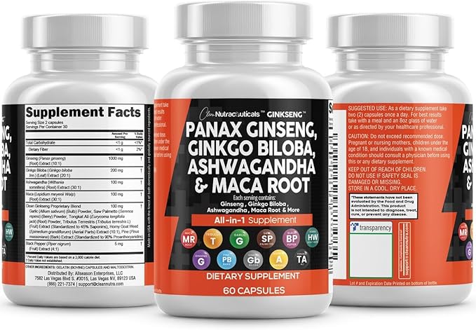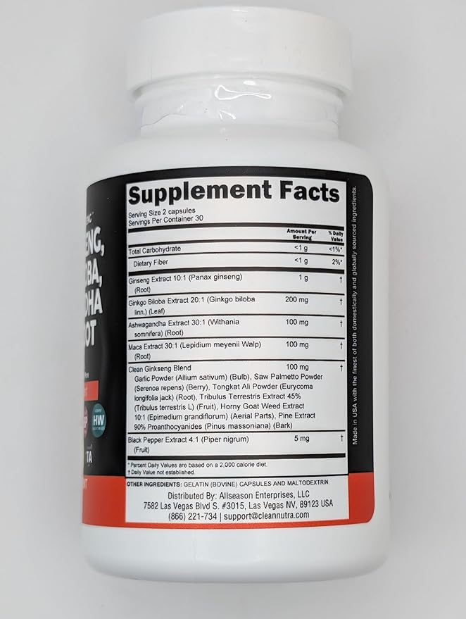 - Advanced Panax Ginseng Ginkgo Biloba Complex for Women and Men - Our product takes extra strength korean red ginseng and ginkgo biloba extracts and combines them with ashwagandha supplements and maca root capsules and the results are amazing. Stop worrying whether or not you have black maca root powder and red maca root today. Clean Nutra has officially created a very potent all in one supplement.