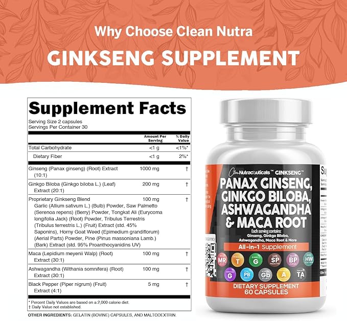 • A Powerful Mood Support Supplement - Ginkseng is overflowing with potent vitamins and stress supplements such as panax ginseng capsules, ginko leaf extract, ashwagandha supplement, and maca supplement. Clear out the countless ginseng supplement, maca root capsules for men, ashwagandha 1000mg, and ginko biloba leaves in your cabinet and replace it with just one inclusive memory support supplements from Clean Nutraceuticals.
