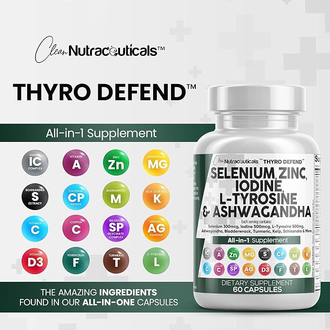 - The Ultimate Thyroid Complex & Iodine Supplement You've Been Looking For - Clean Nutra ThyroDefend provides 5 full-dose products in one thyroid support complex containing a full zinc supplement, iodine supplements for thyroid, selenium supplements, tyrosine powder, and ashwagandha supplements in a convenient 2 capsule dosage. Finally, iodine pills, zinc 50 mg and an ashwagandha supplement have been packed into one convenient solution.